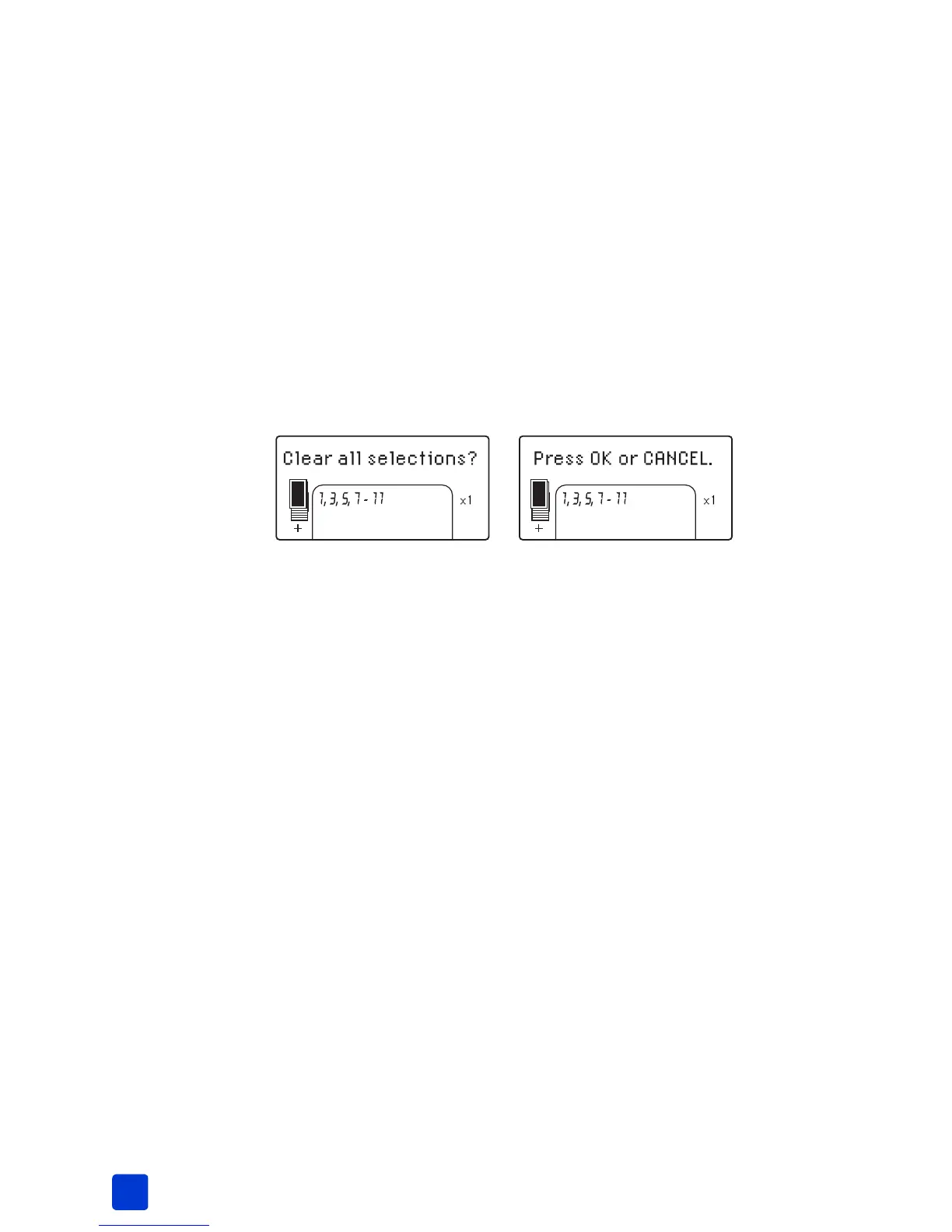 The messages CLEAR ALL SELECTIONS? and then PRESS OK OR CANCEL. flash