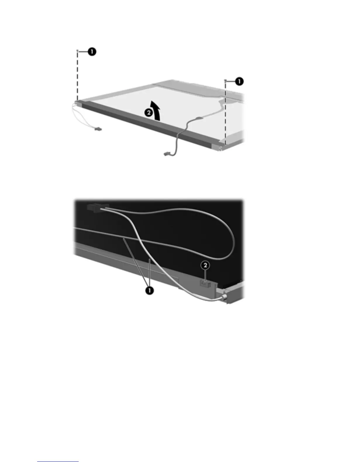 15. Remove the backlight cables (1) from the clip (2) in the display panel.