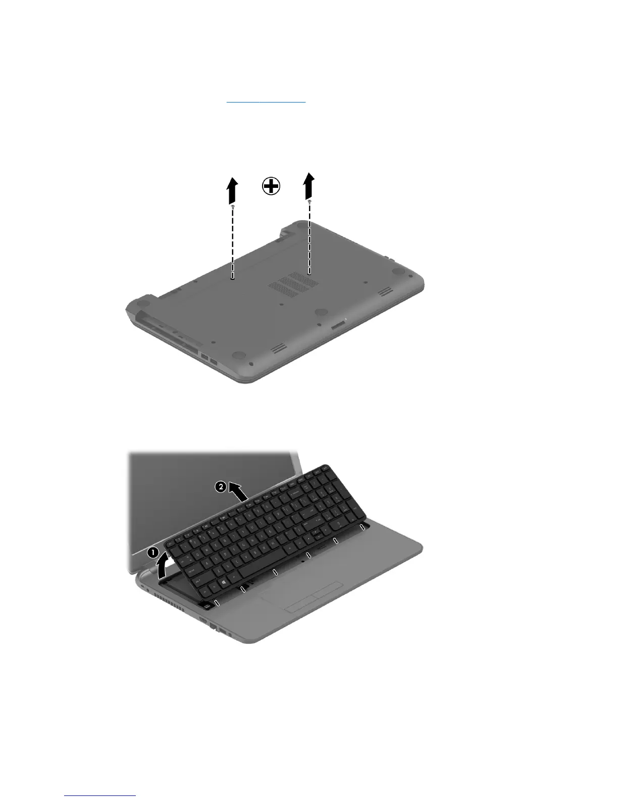 4. Lift to rotate up the top of the keyboard (1), and then lift the keyboard (2) to disengage it from the