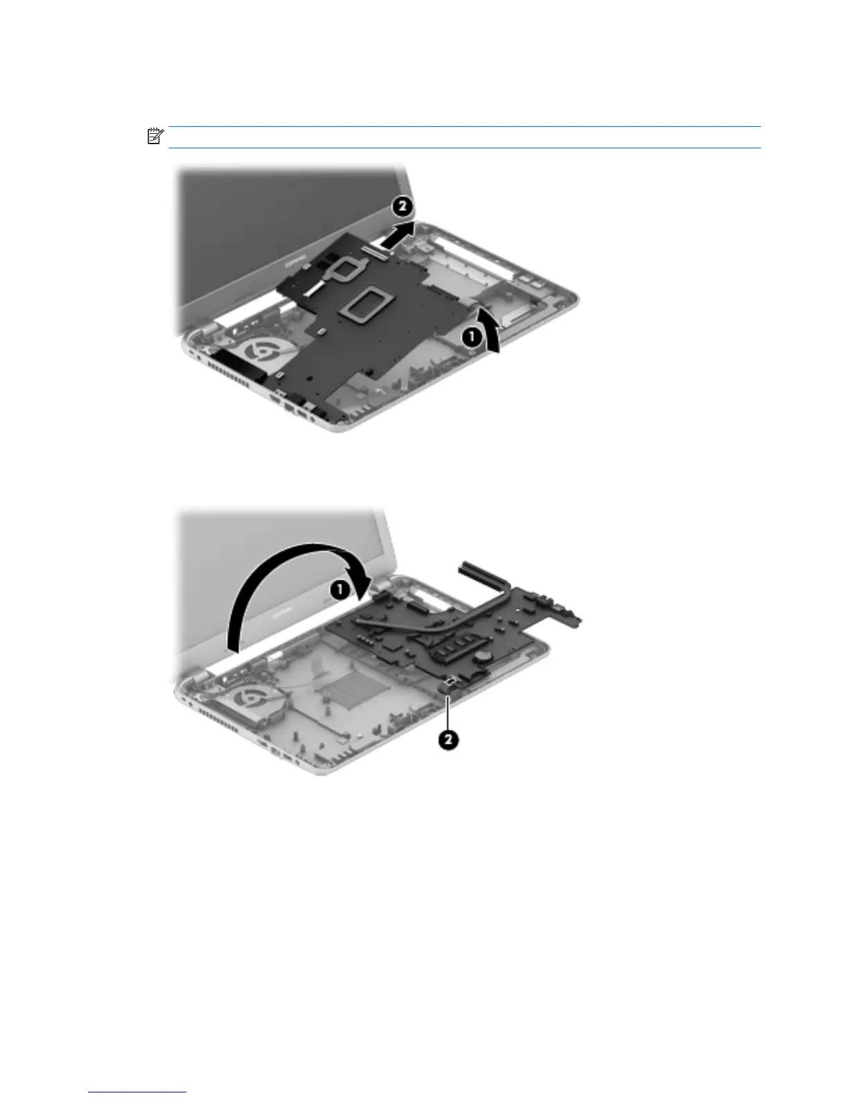 NOTE: Be careful not to inadvertently disconnect the speaker cable when lifting the system board.