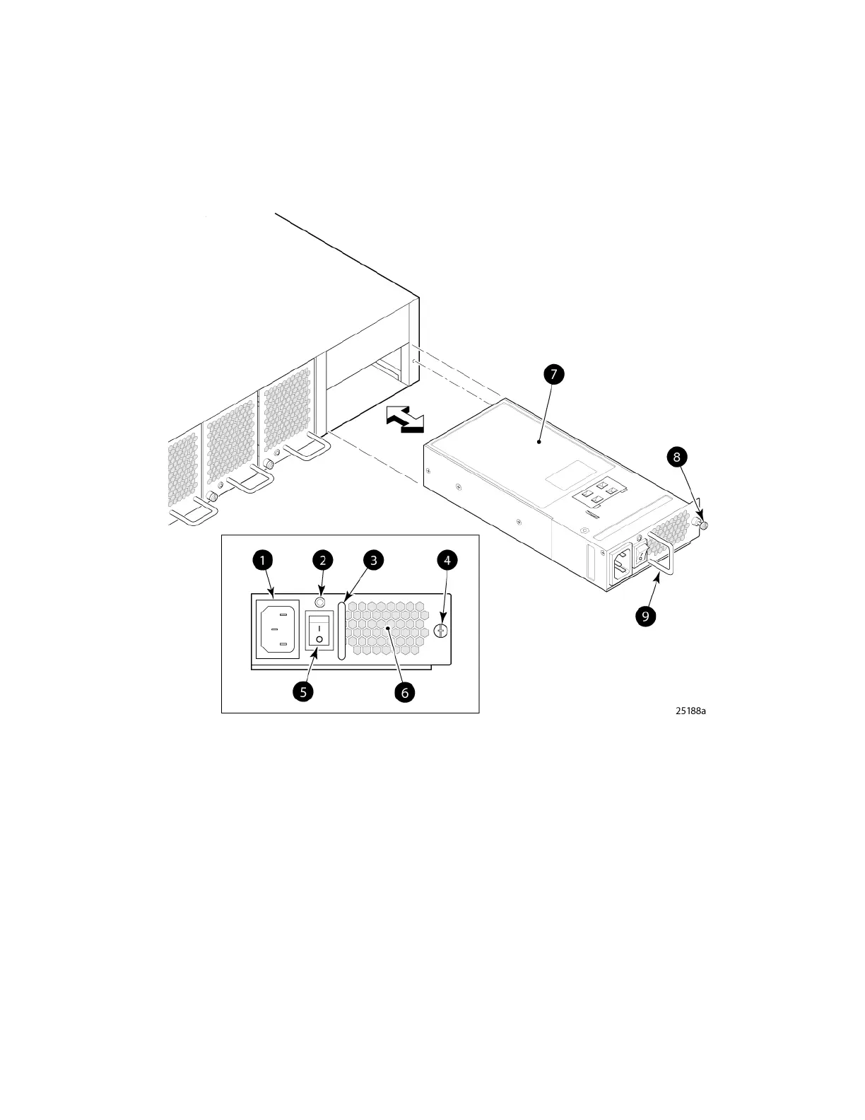 Figure 38 Installing a power supply in the 8/80 or Encryption SAN Switch