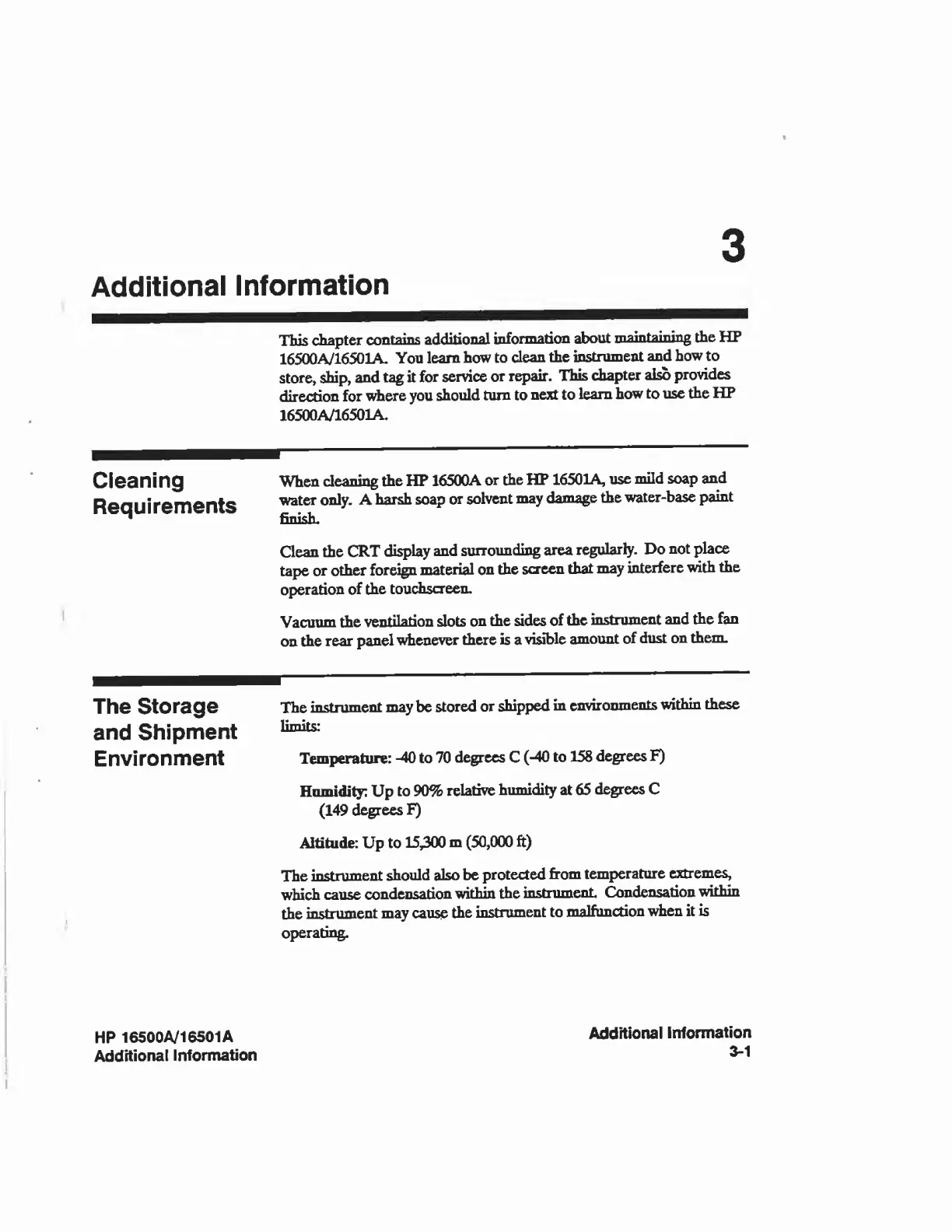 HP 16500A - Chapter 3 Additional Information; Cleaning Requirements; The Storage and Shipment Environment.3-1