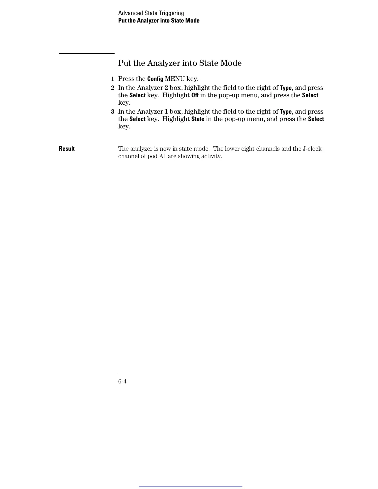 Result The analyzer is now in state mode. The lower eight channels and the J-clock