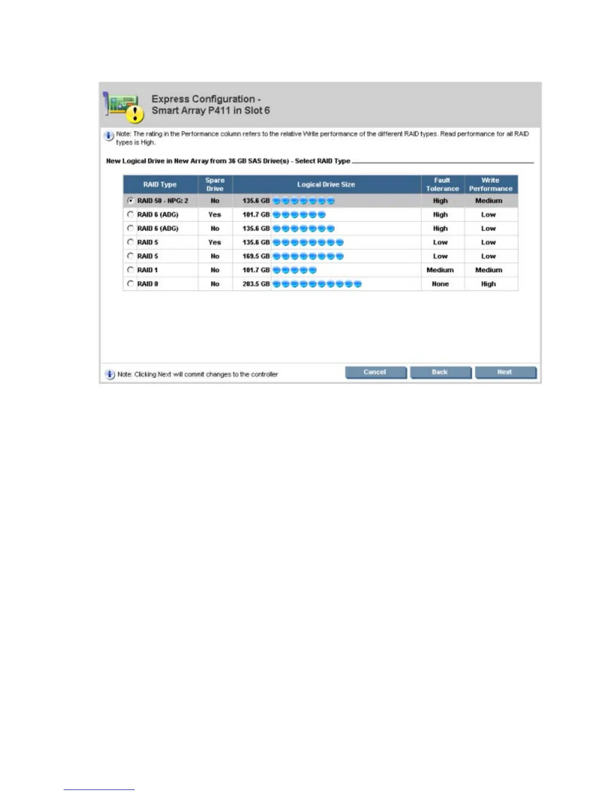 ACU displays possible logical drive configurations based on groupings of drives with the same