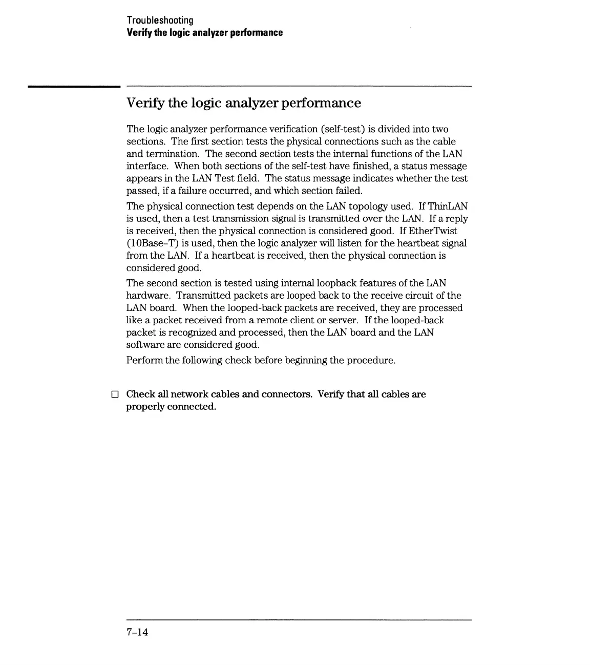 The logic analyzer performance verification (self-test) is divided into two
