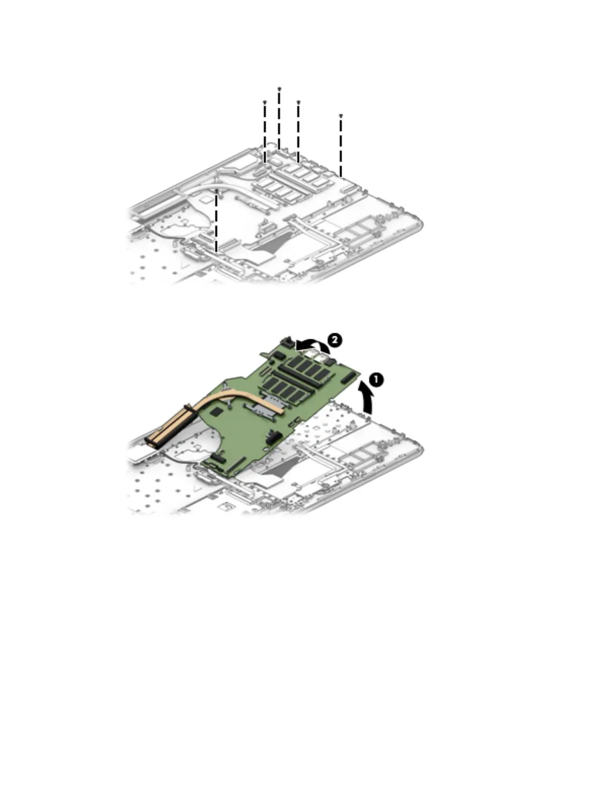 3. Lift the right side of the system board (1), and then turn the system board upside down (2) to access the