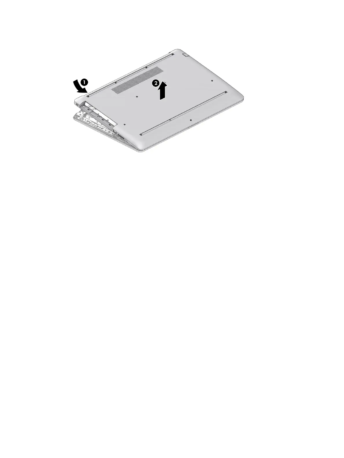 3. Starting near the optical drive bay (1), pry the bottom cover up to remove it (2).