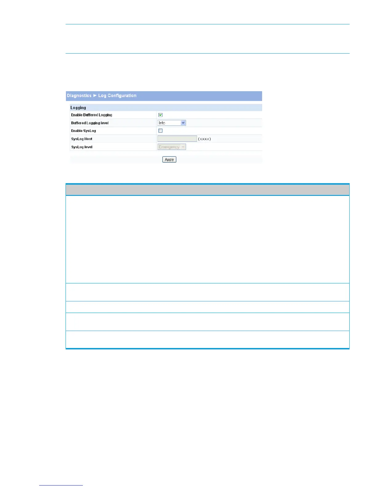 To display the Log Configuration page, click Diagnostics > Log Configuration in the navigation