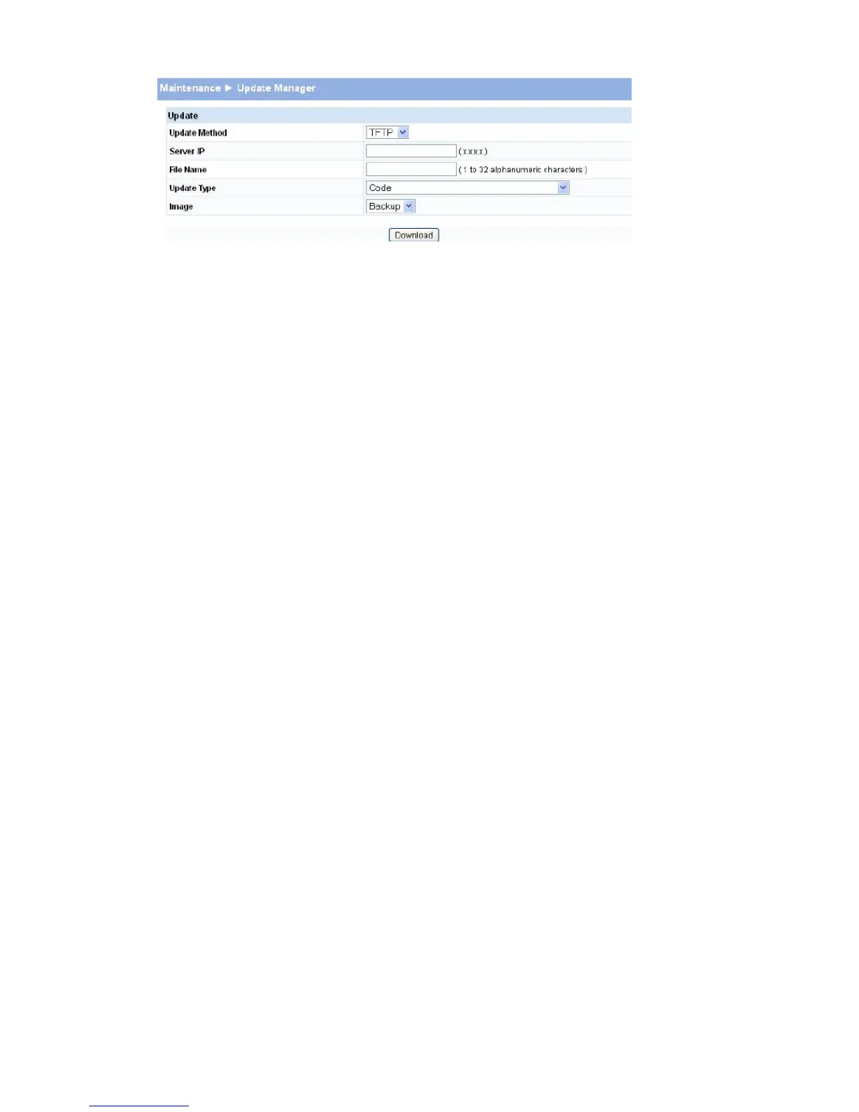 For a TFTP upload, enter the Server IP address, and specify the File Path and File Name.