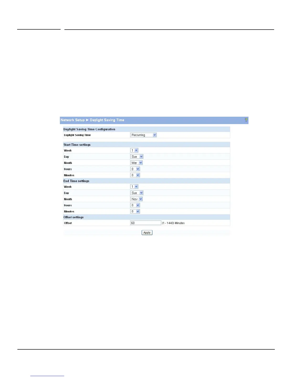 To display the Daylight Saving Time page, click Network Setup > Daylight Saving Time in the navigation