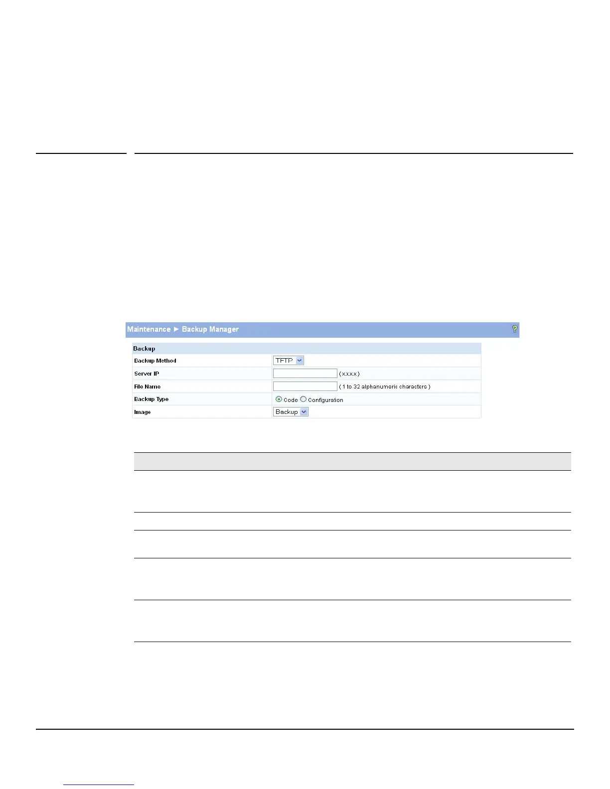 The Backup Manager page provides a means to save a backup copy of the switch’s image or configu-