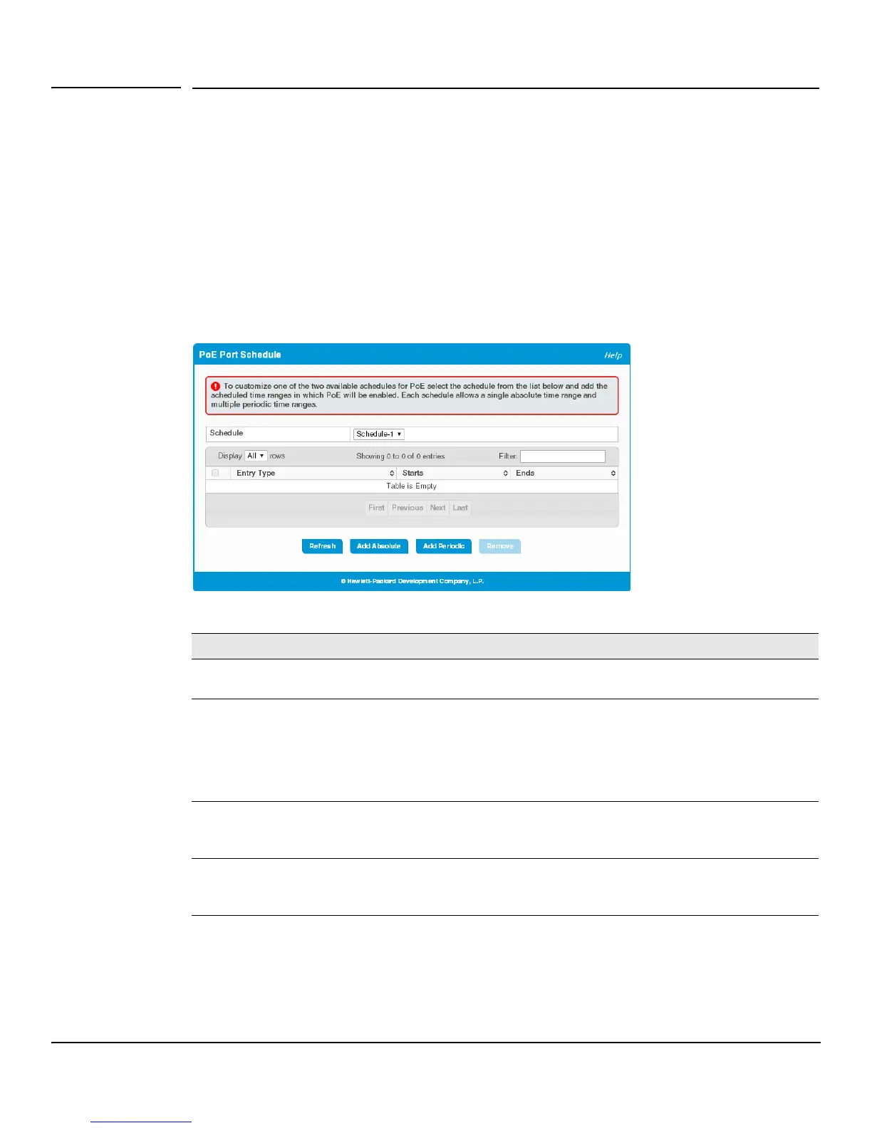 To display the PoE Port Schedule page, click Power Over Ethernet > Schedule in the navigation pane.