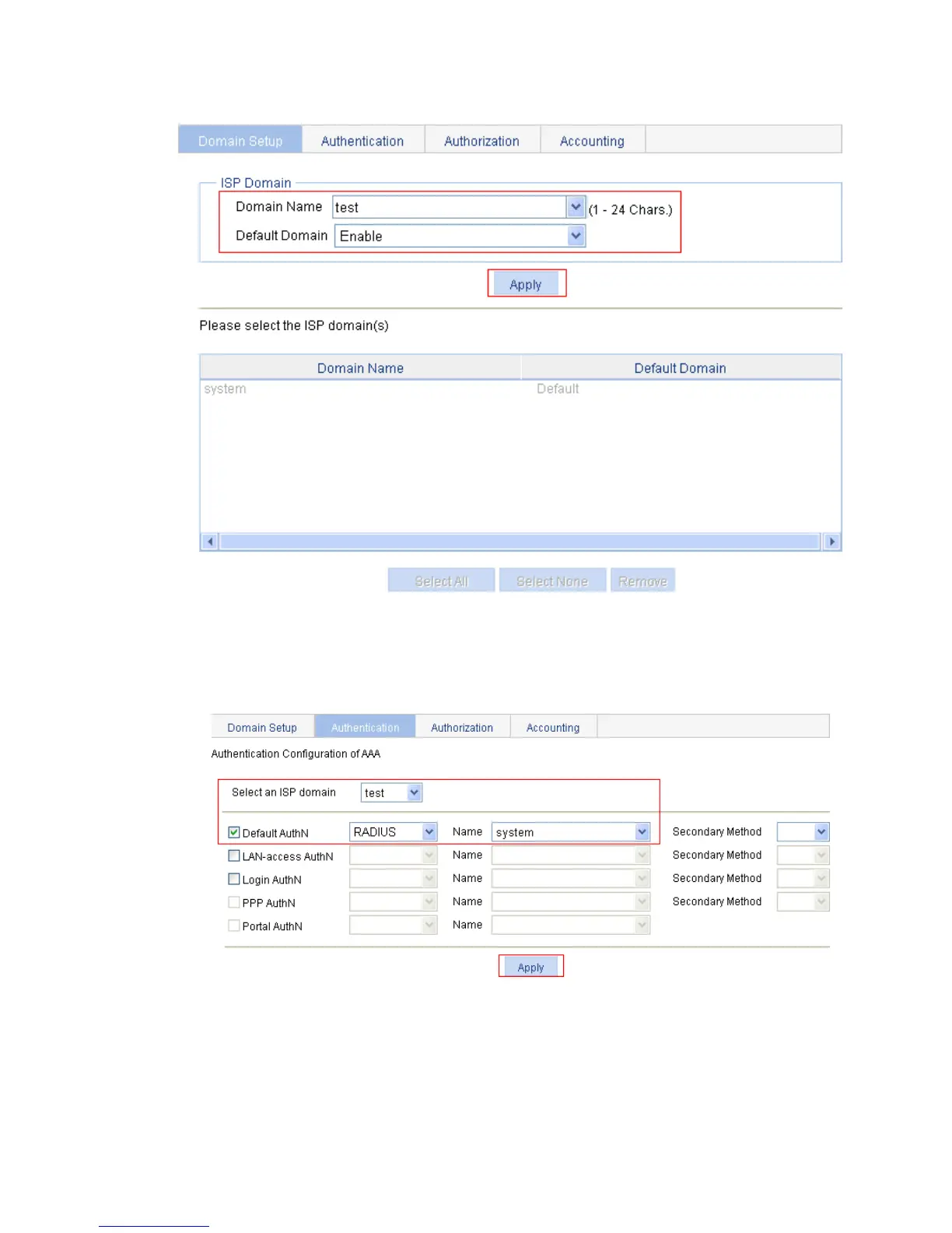 4. On the Authentication tab, select the ISP domain test, select the Default AuthN box, select the