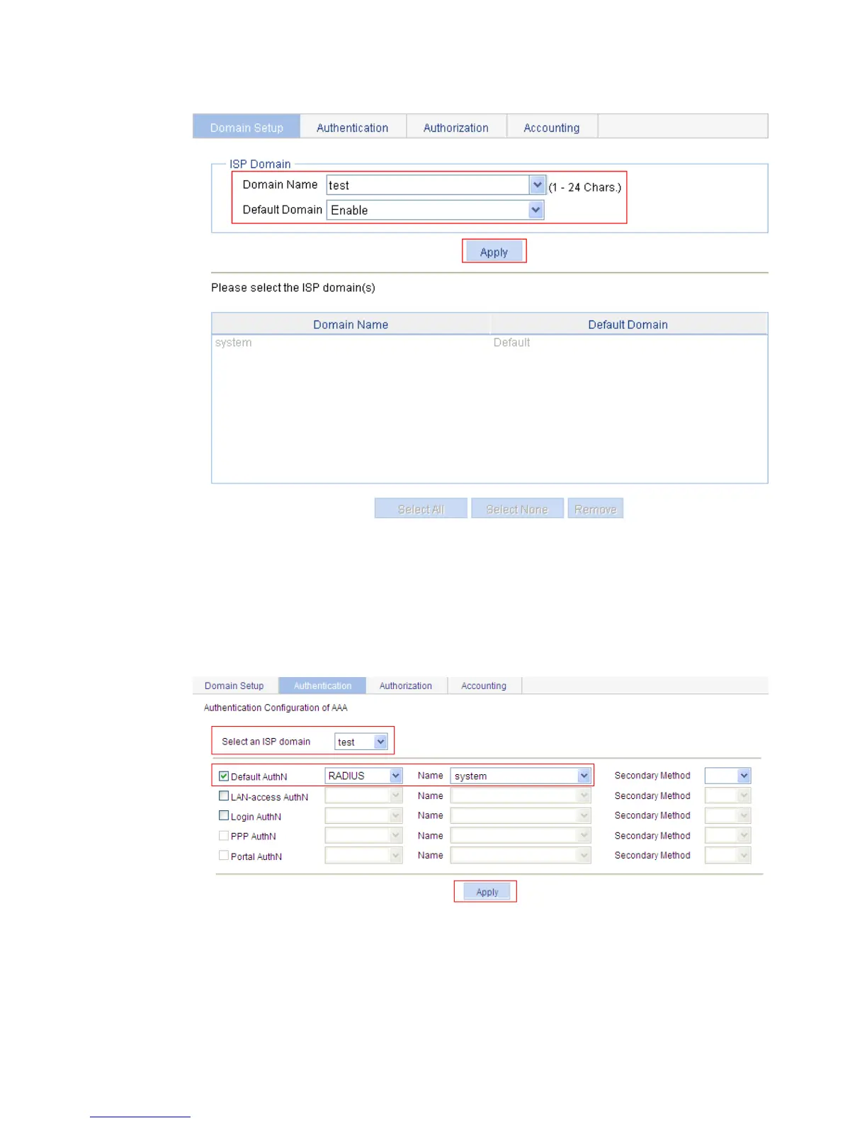 c. On the Authentication tab, select the ISP domain test, select the Default AuthN box, select