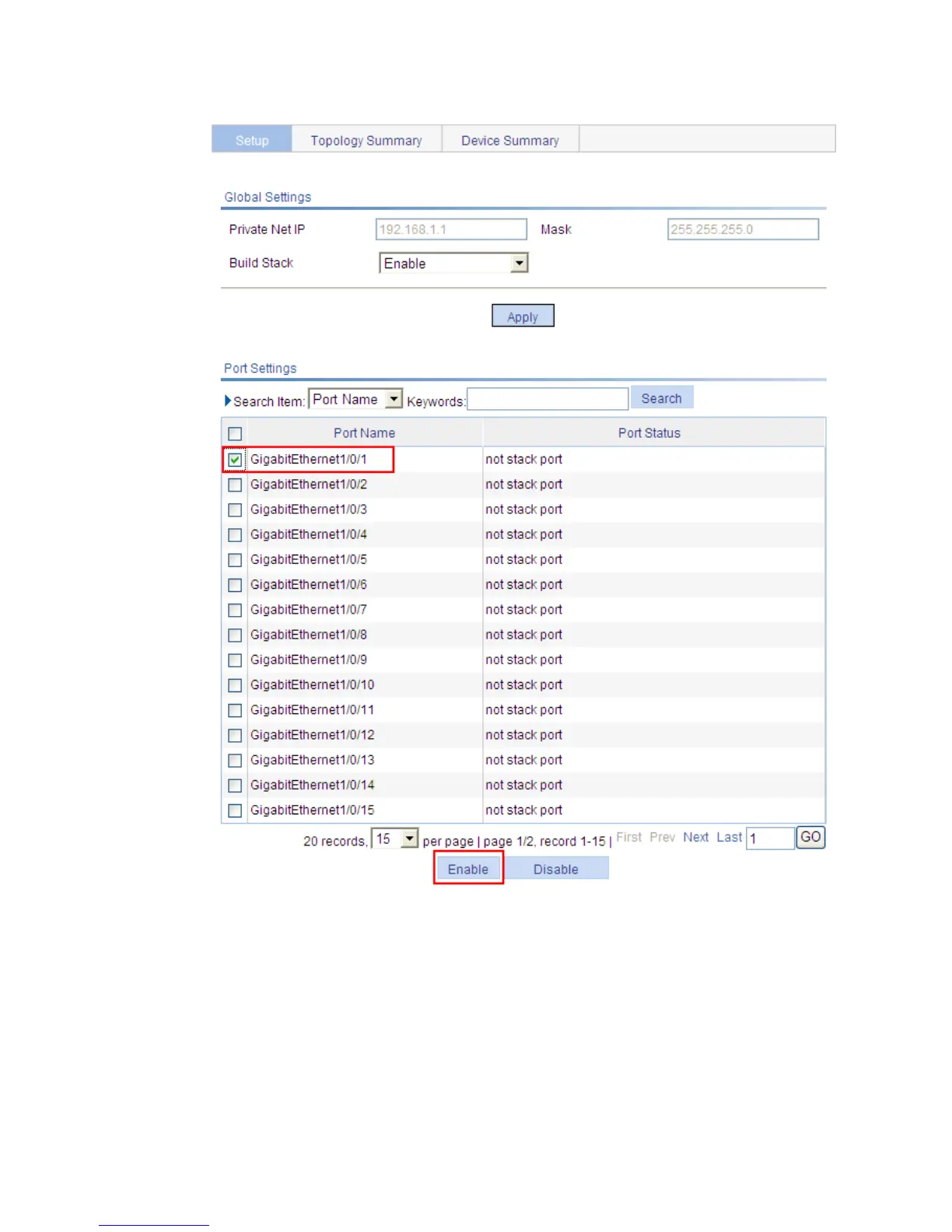 b. On the Setup tab, select GigabitEthernet1/0/1, GigabitEthernet1/0/2, and