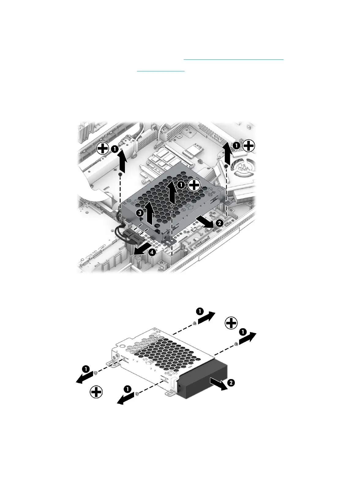 6. Remove the four Phillips screws from the sides of the hard drive cage (1).