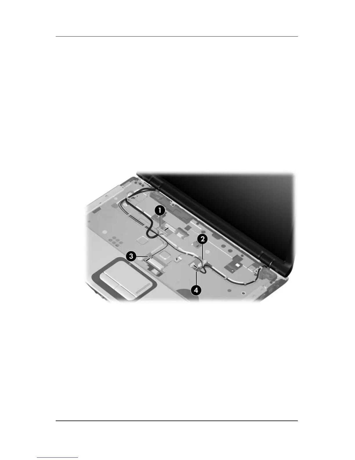 7. Remove the wireless antenna cables 4 from the hole in the
