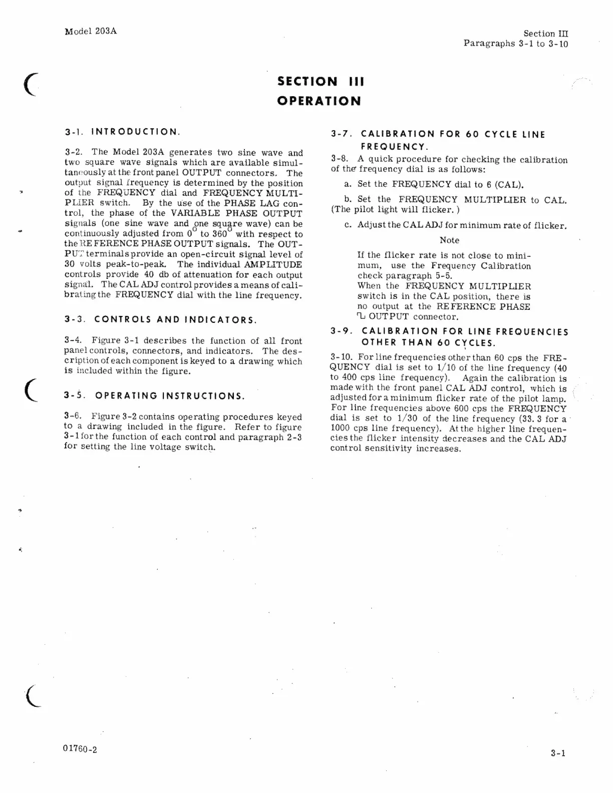 HP 203A - Controls and Indicators; Operation; Calibration for 60 Cycle Line; Calibration for Line Frequencies