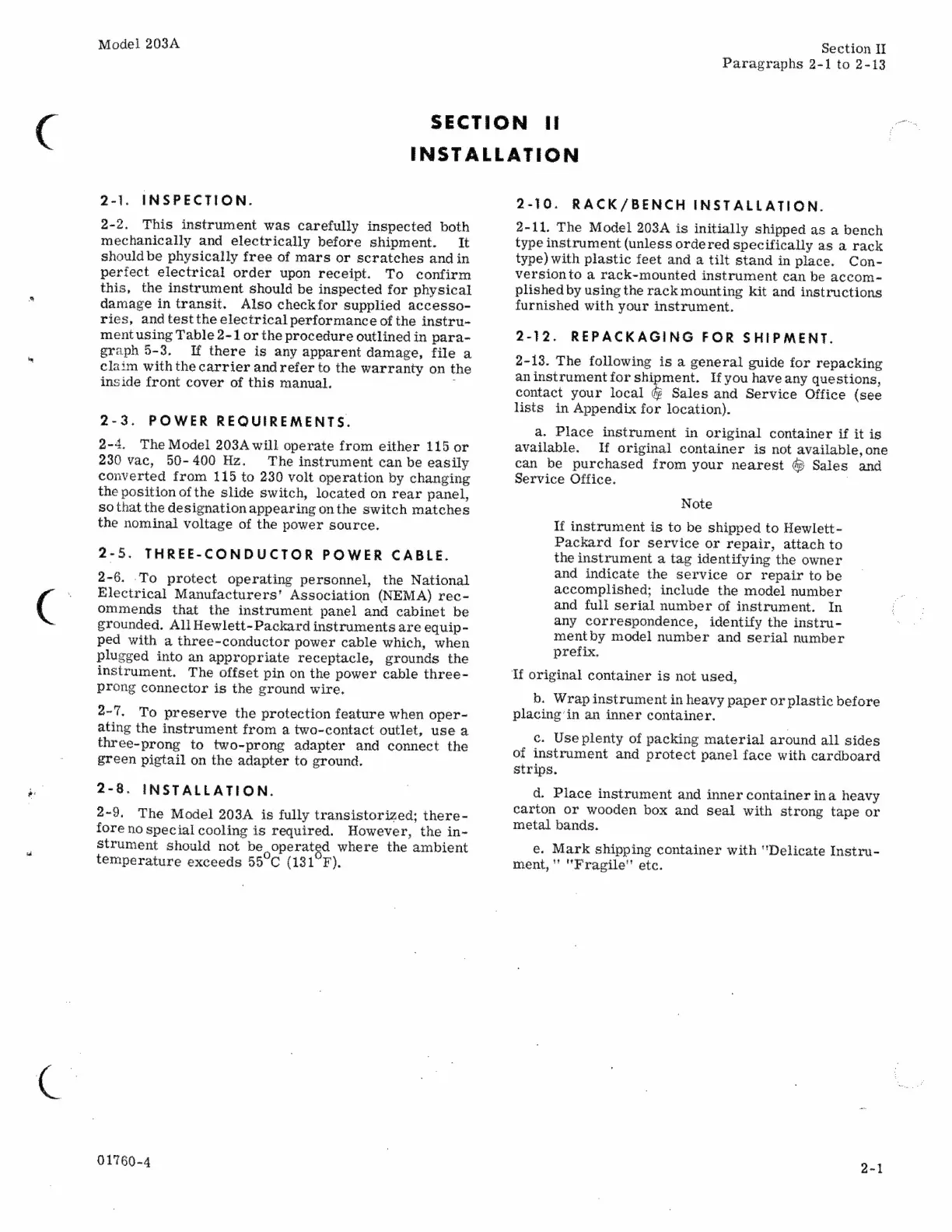 HP 203A - Section IL INSTALLATION; Inspection; Power Requirements; Three-Conductor Power