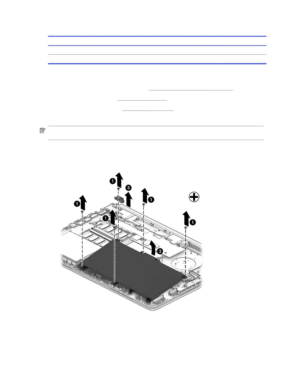 1. Remove the five screws (1) securing the battery.