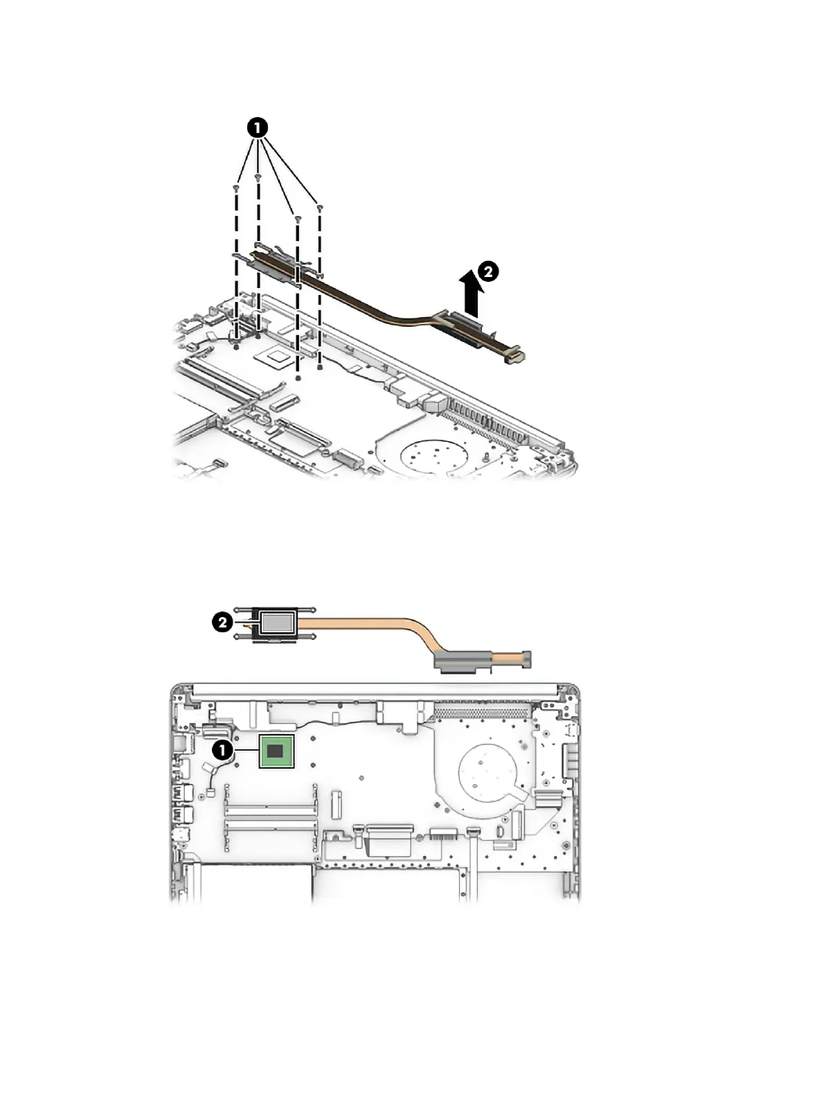 Thermal paste is used on the integrated system board processor (1) and the heat sink (2).