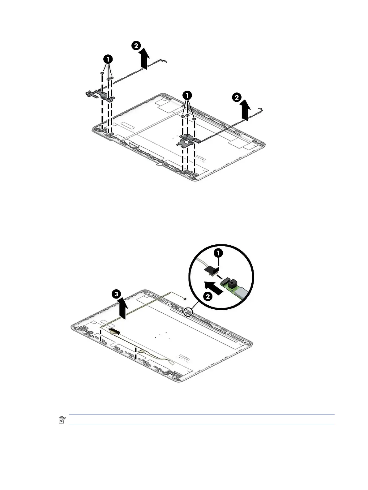 13. To remove the wireless antennas and cables, peel the antennas (1) off the display enclosure, and