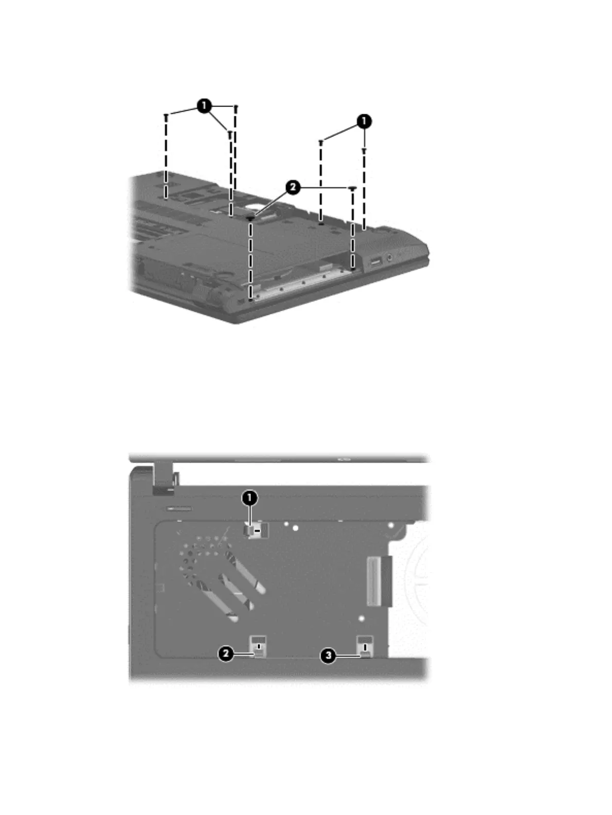4. Remove the two Phillips PM2.0×2.0 broad head screws (2) in the optical drive bay that secure