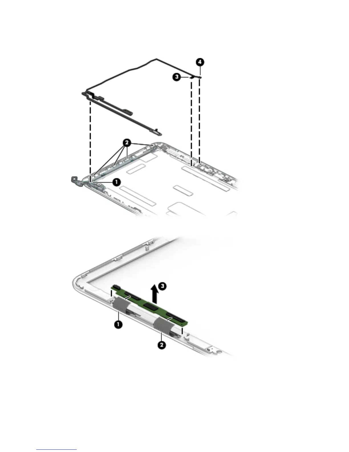 (1), and then remove the cable from the display enclosure (2).