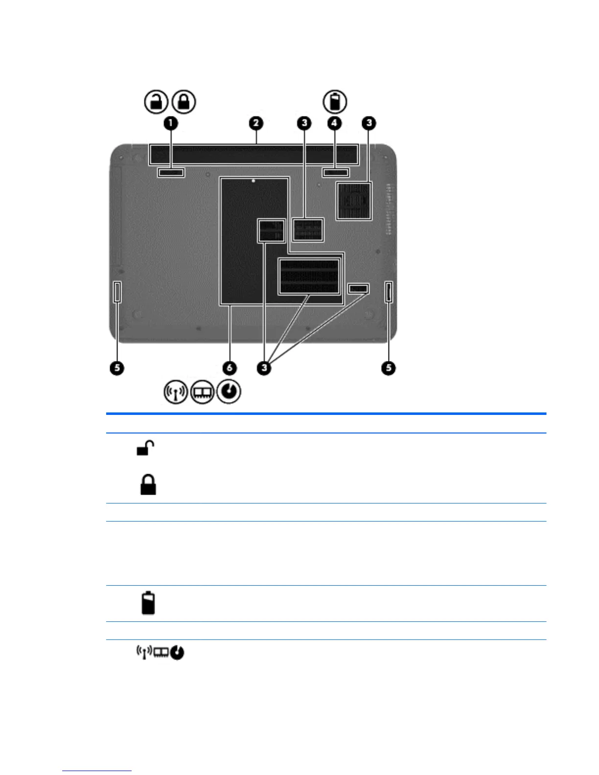 Battery lock and unlock latch Locks and unlocks the battery in the battery bay.