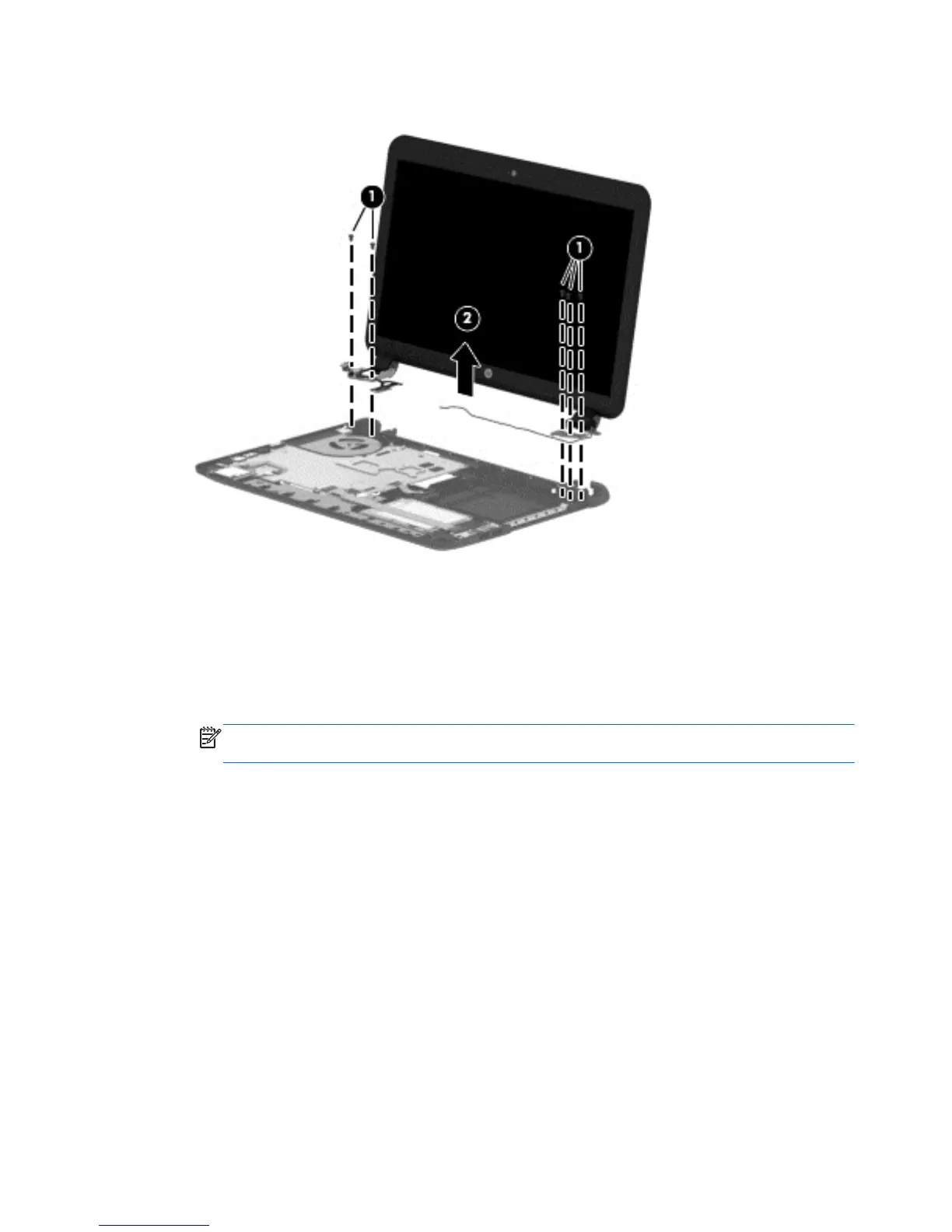 a. Remove the two Mylar screw covers (1) and the two Phillips PM2.5×4.5 screws (2) that secure the