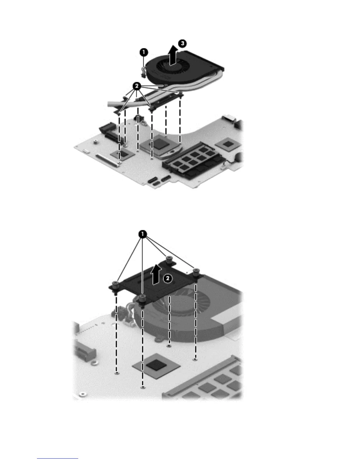 a. Loosen the four Phillips screws that secure the heat sink to the system board (1).