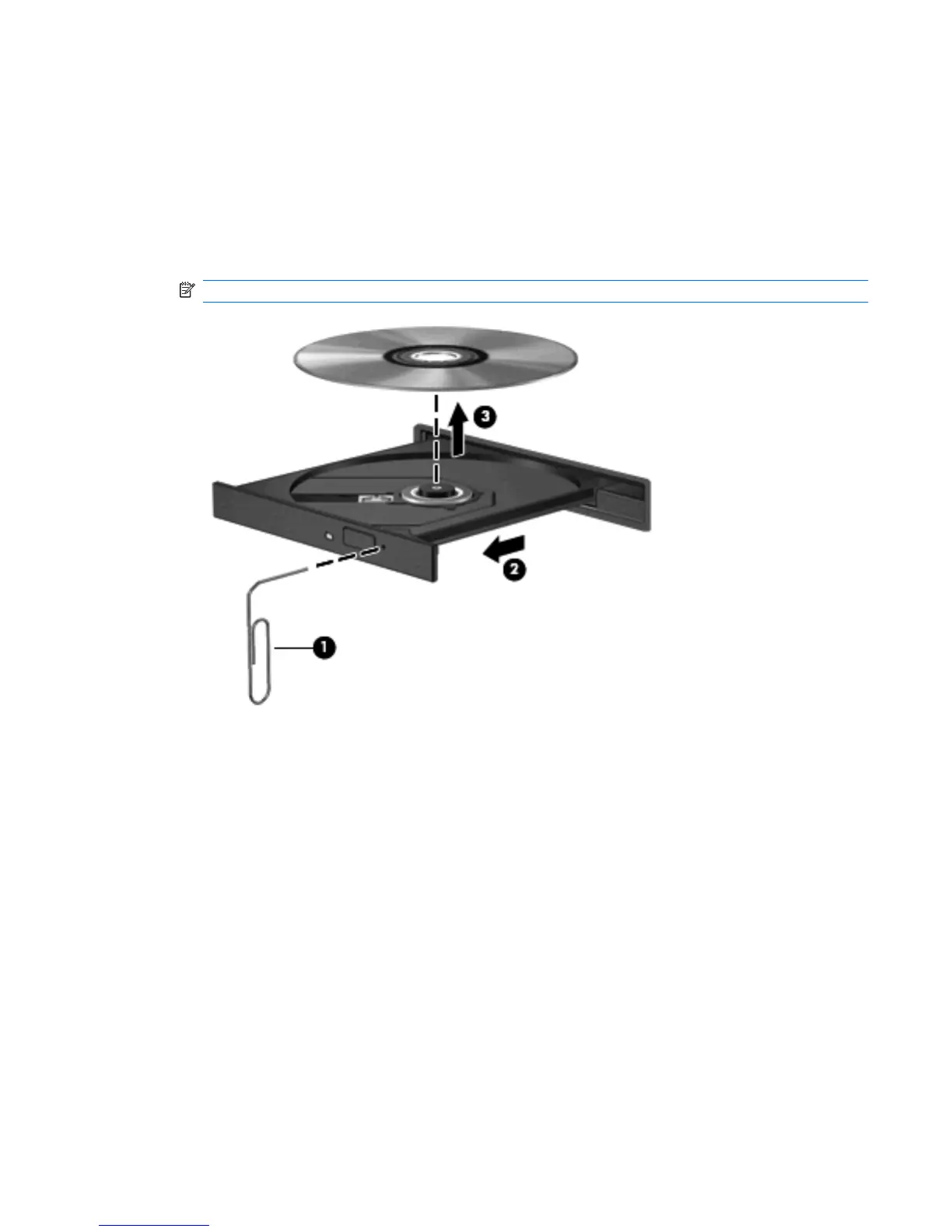 1. Insert the end of a paper clip (1) into the release access in the front bezel of the drive.