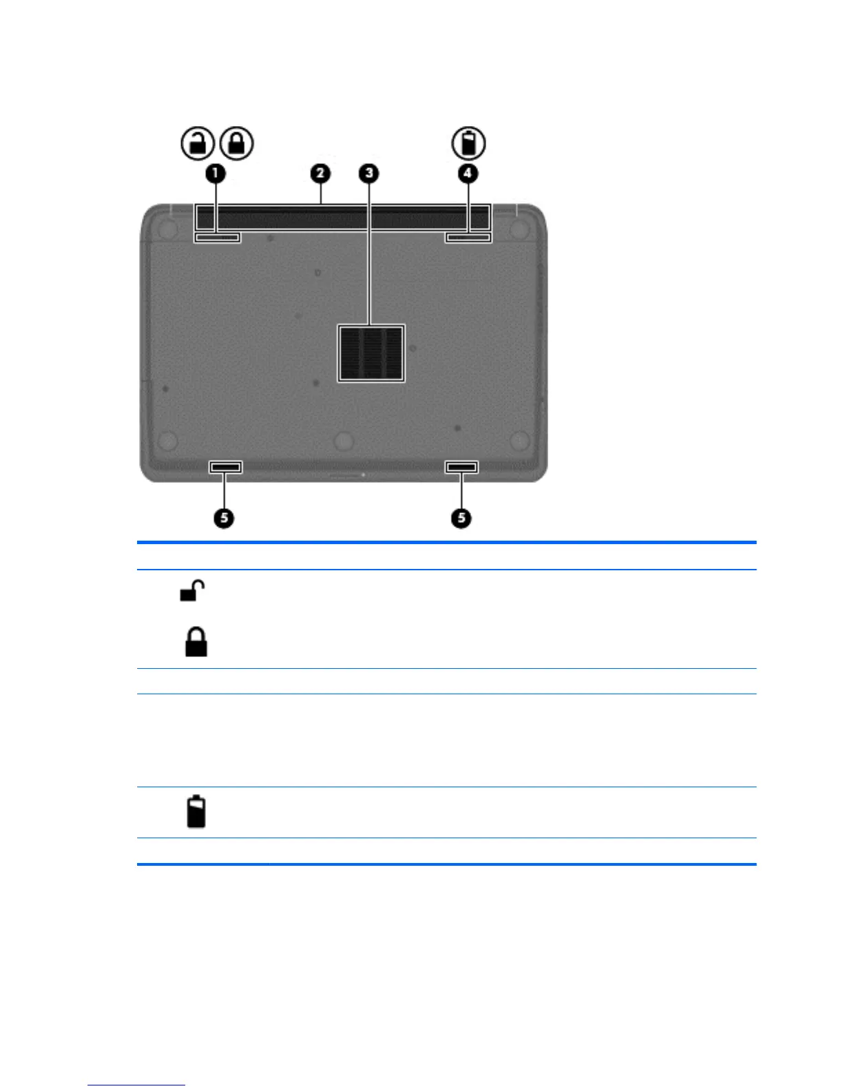 Battery lock and unlock latch Locks and unlocks the battery in the battery bay.