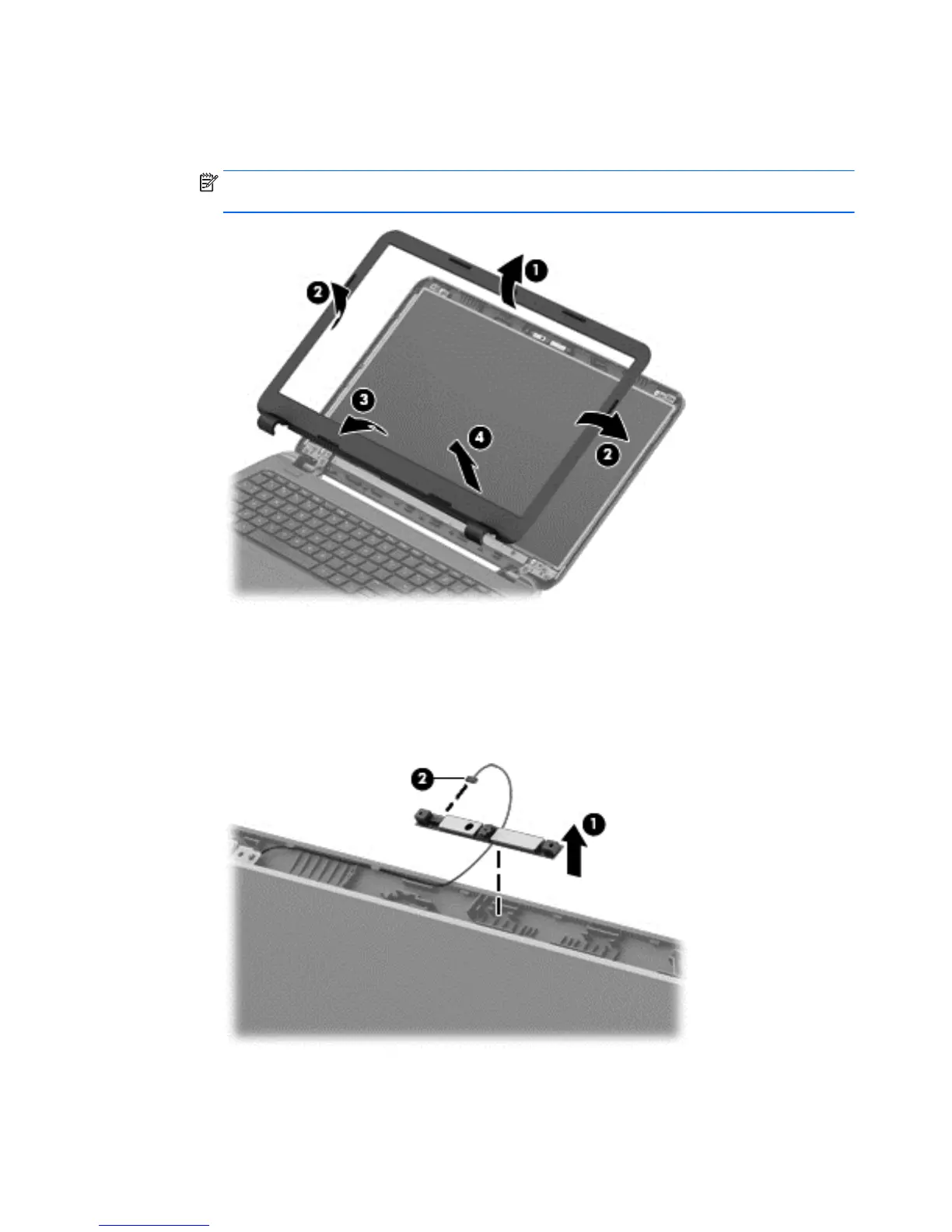 c. Remove the webcam/microphone module (2). (The module is attached to the display enclosure