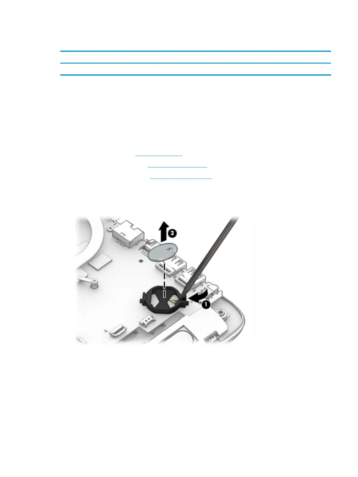 Using a thin tool or screwdriver, disengage the battery from the socket (1), and then remove the battery
