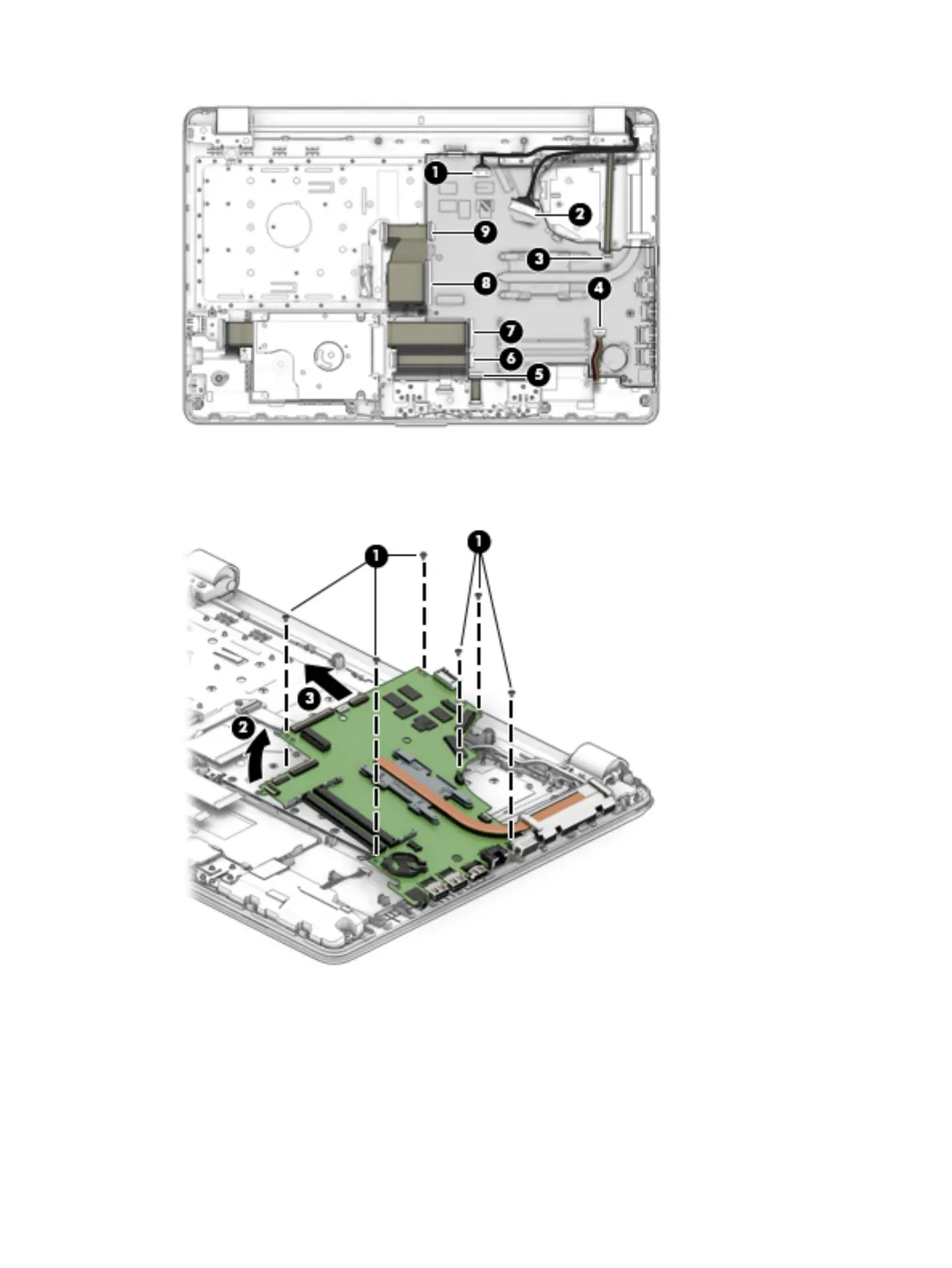 2. Remove the six Phillips PM2.0×3.0 screws (1) that secure the system board to the computer.