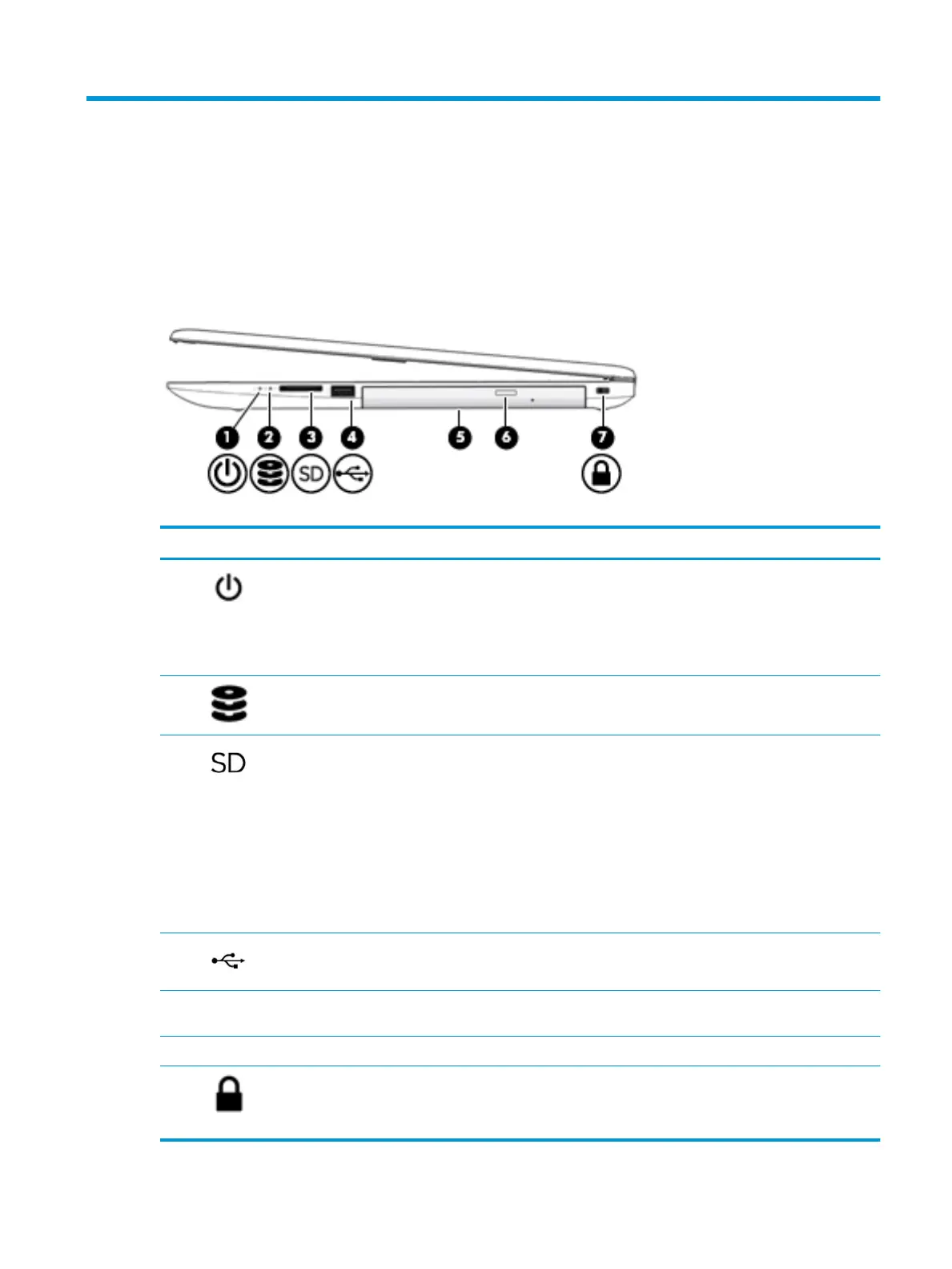 (6) Optical drive eject button Releases the optical drive disc tray.