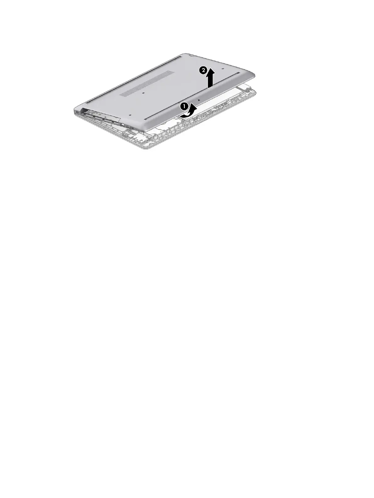 3. Starting near the middle, bottom of the bottom cover (1), pry the cover up to remove it (2).