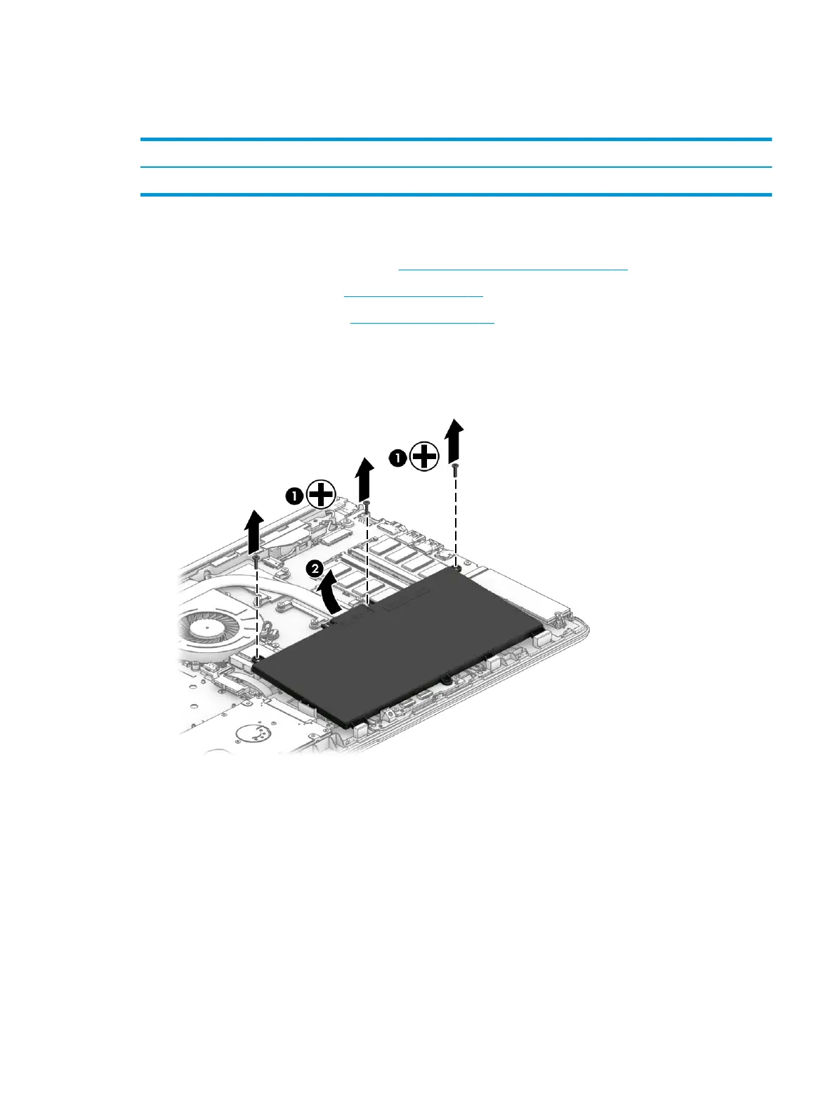 1. Remove the three Phillips M2.0 × 8.0 screws (1) that secure the battery to the computer.