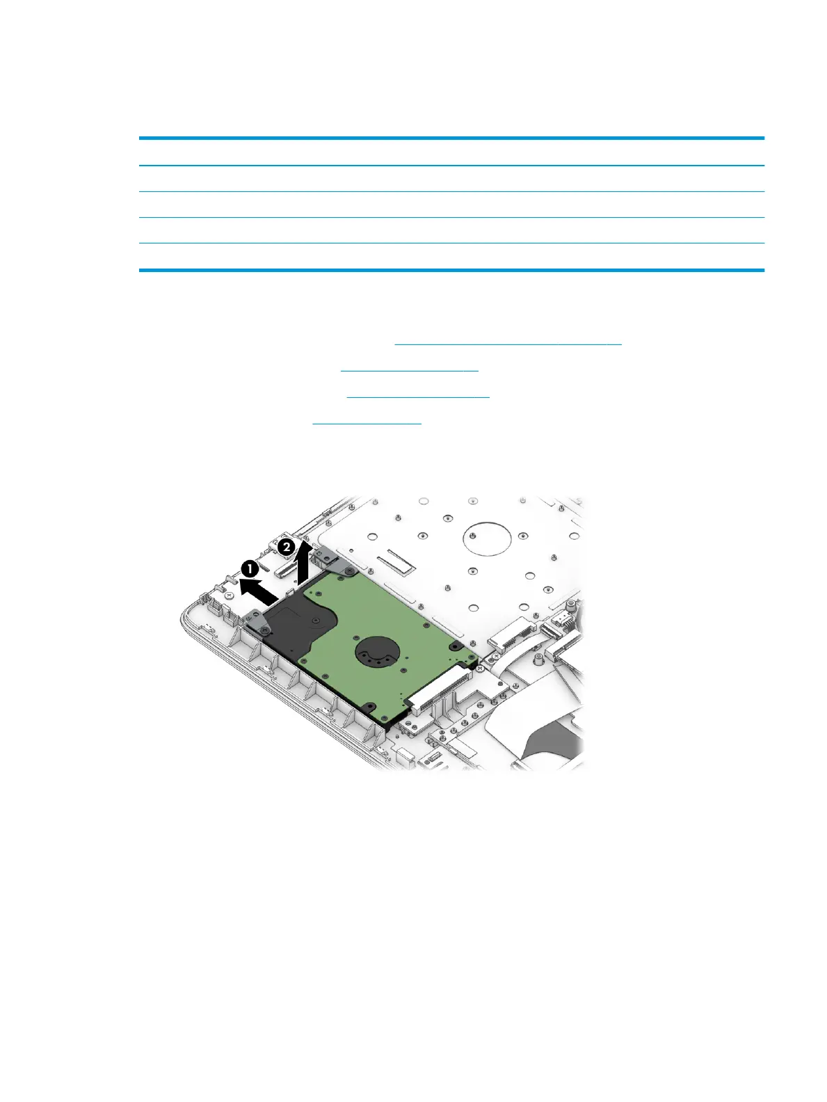 1. Slide the hard drive away from the connector (1), and then lift the hard drive out of the computer (2).