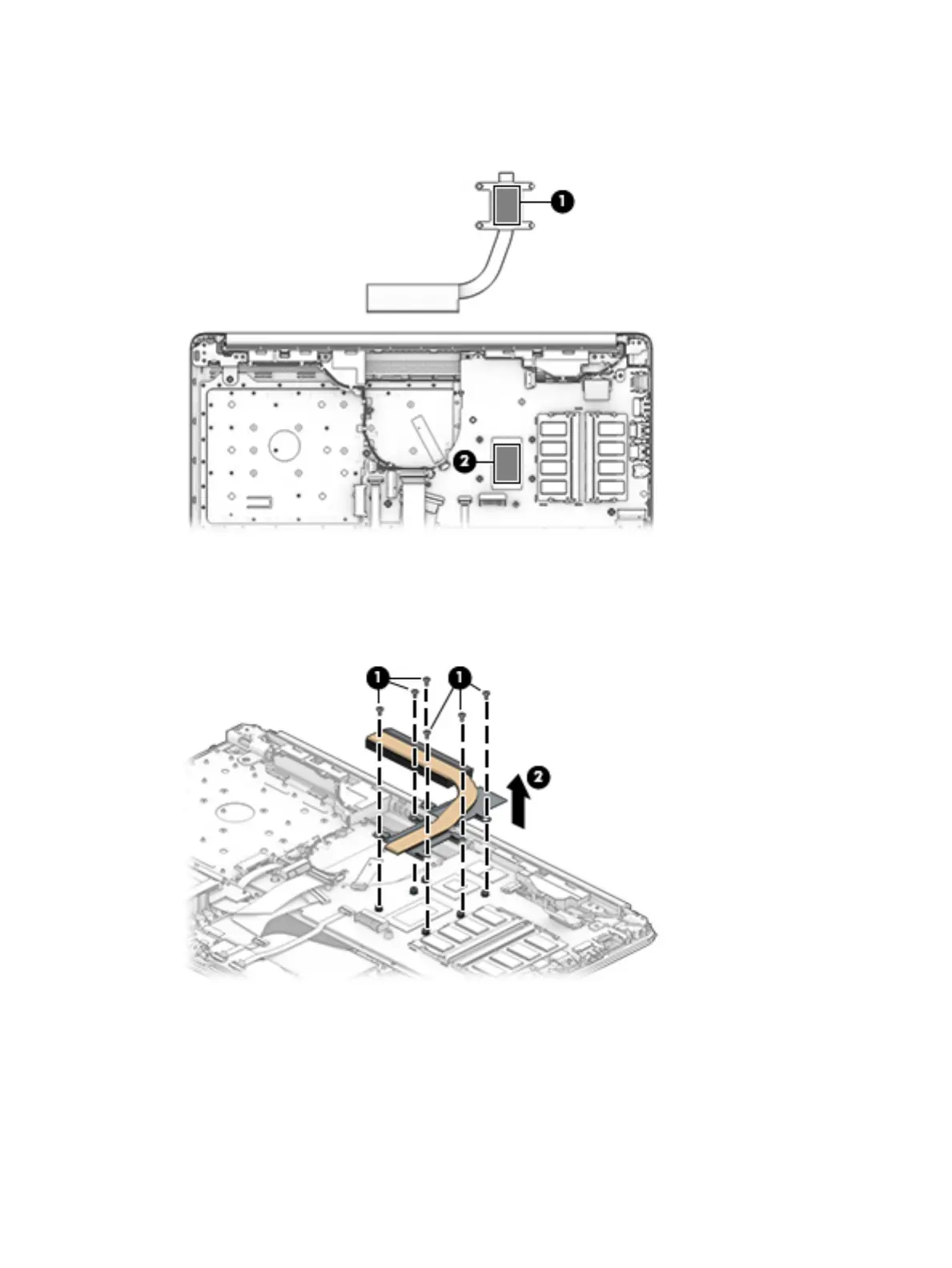 1. In the order indicated on the heat sink assembly, remove the six Phillips M2.0 × 3.0 screws (1) that