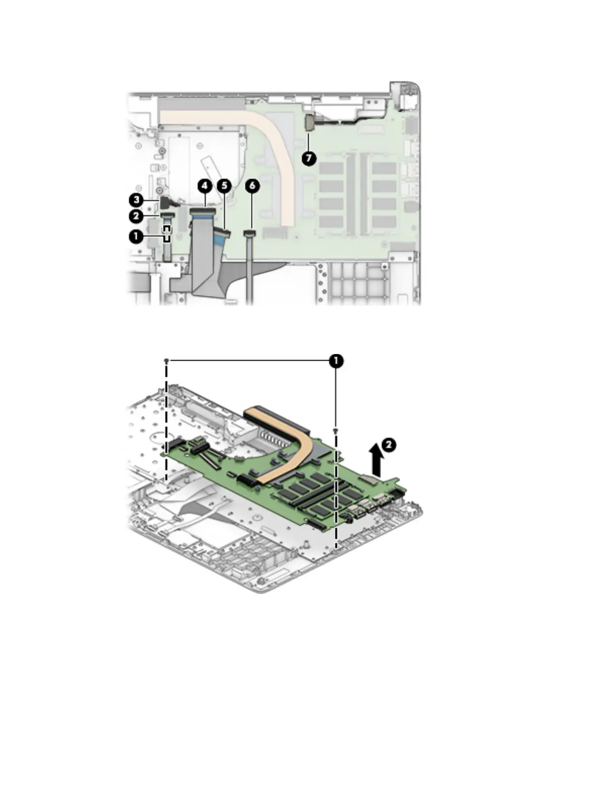 2. Remove the two Phillips M2.0 × 3.0 screws that secure the system board to the computer (1).
