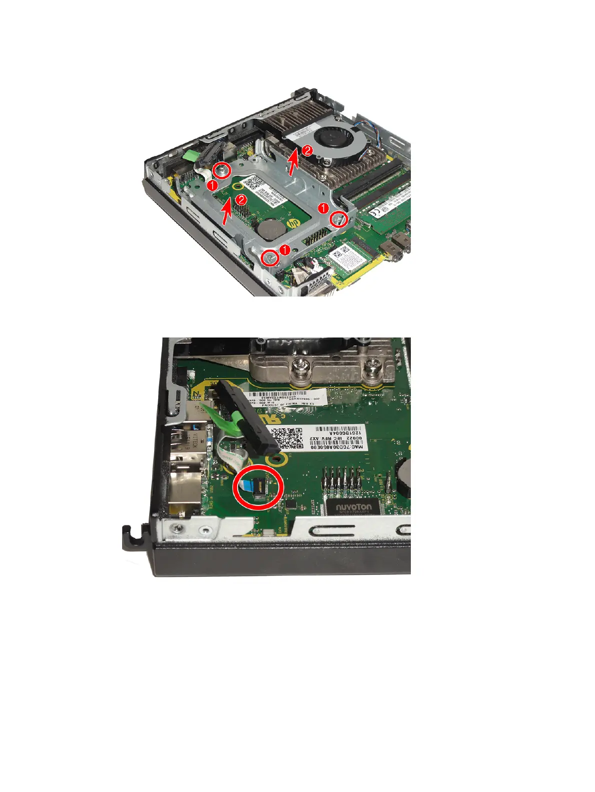 5. Remove the drive cage from the computer to access the drive cable connector under the drive cage (2).