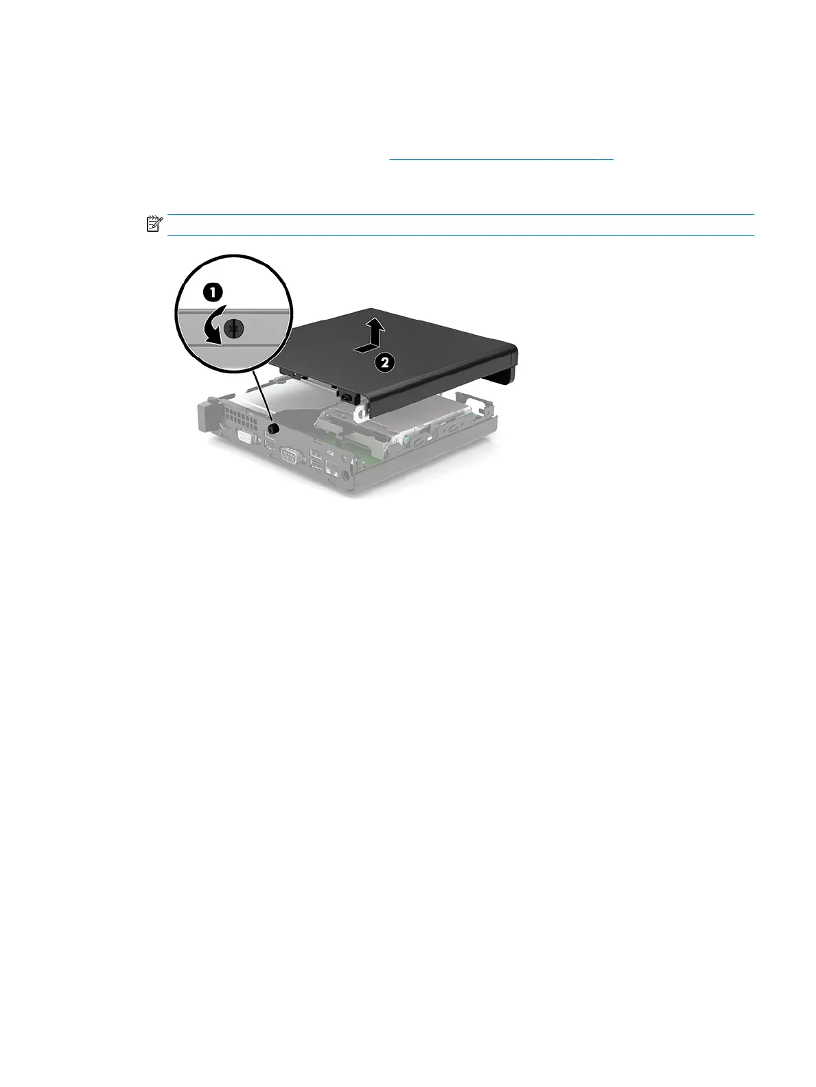 2. Loosen the thumbscrew on the rear of the computer (1), and then slide the panel forward and lift it o