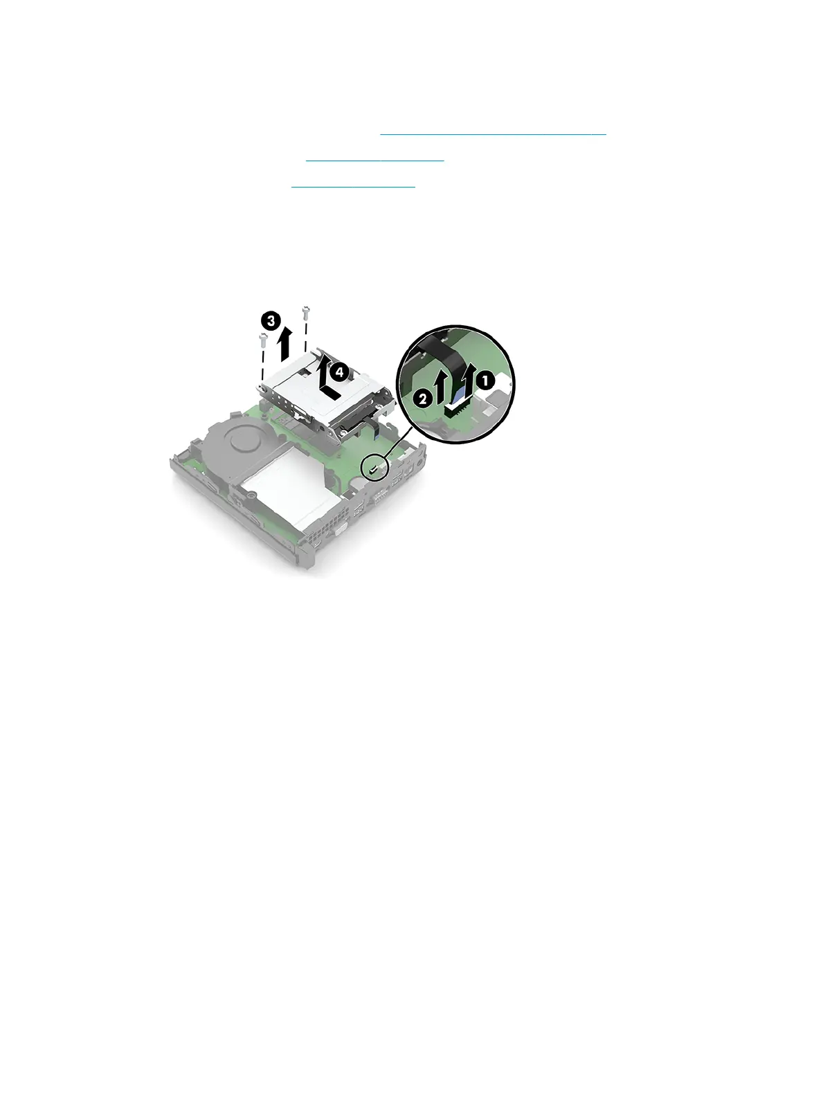 6. Slide the hard drive cage back, and then lift it out of the chassis (4).