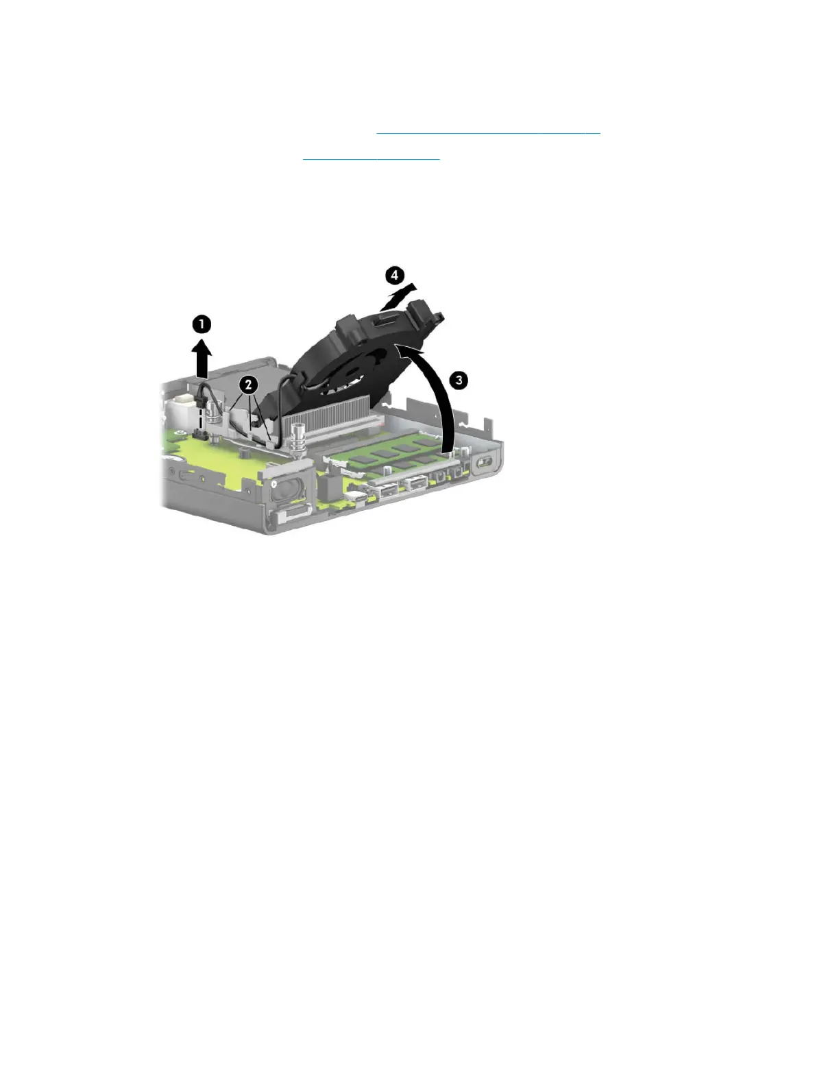 5. Lift fan up to about 30-45 degrees (3), and then pull it away from the heat sink (4).