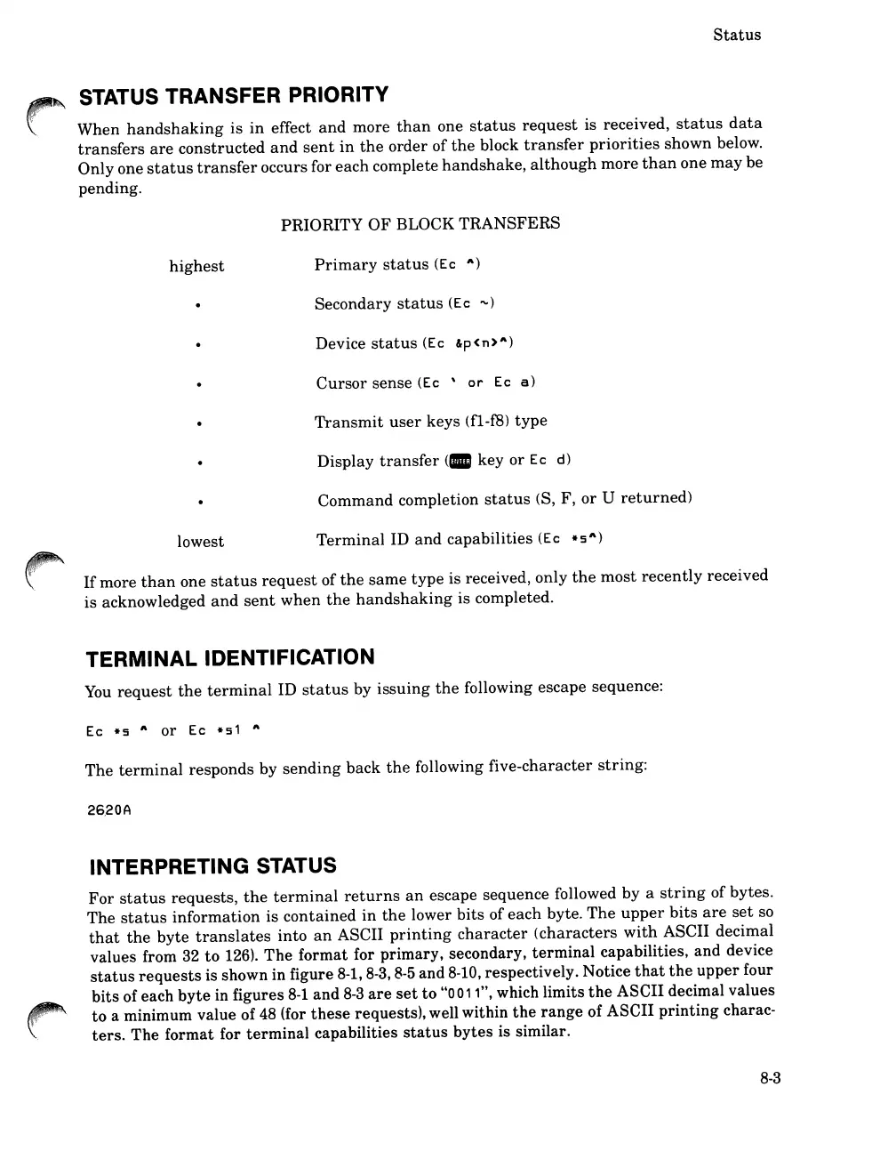 HP 262SA - Status Transfer Priority; Terminal Identification; Interpreting Status