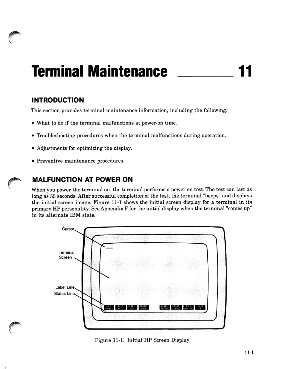 HP 262SA - Terminal Maintenance; Introduction; Malfunction at Power on; Initial HP Screen Display
