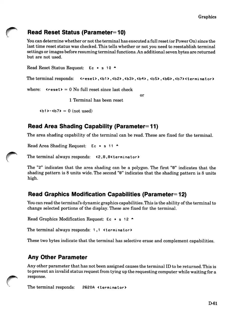 HP 262SA - Read Reset Status (Parameter=10; Read Area Shading Capability (Parameter = 11; Read Graphics Modification Capabilities (Parameter = 12; Any Other Parameter