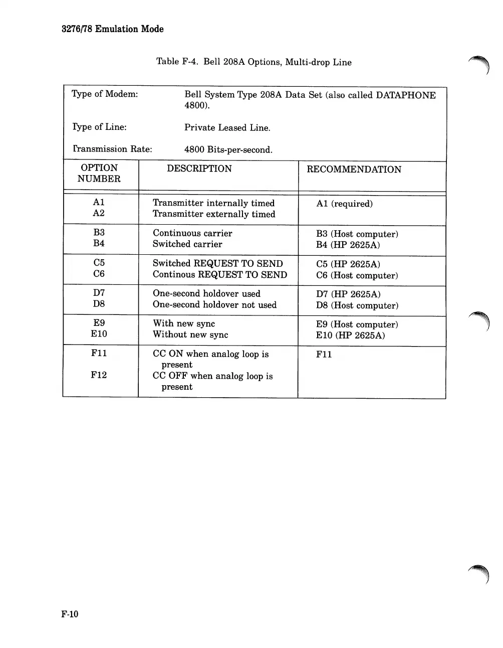 Table F-4. Bell 208A Options, Multi-drop Line